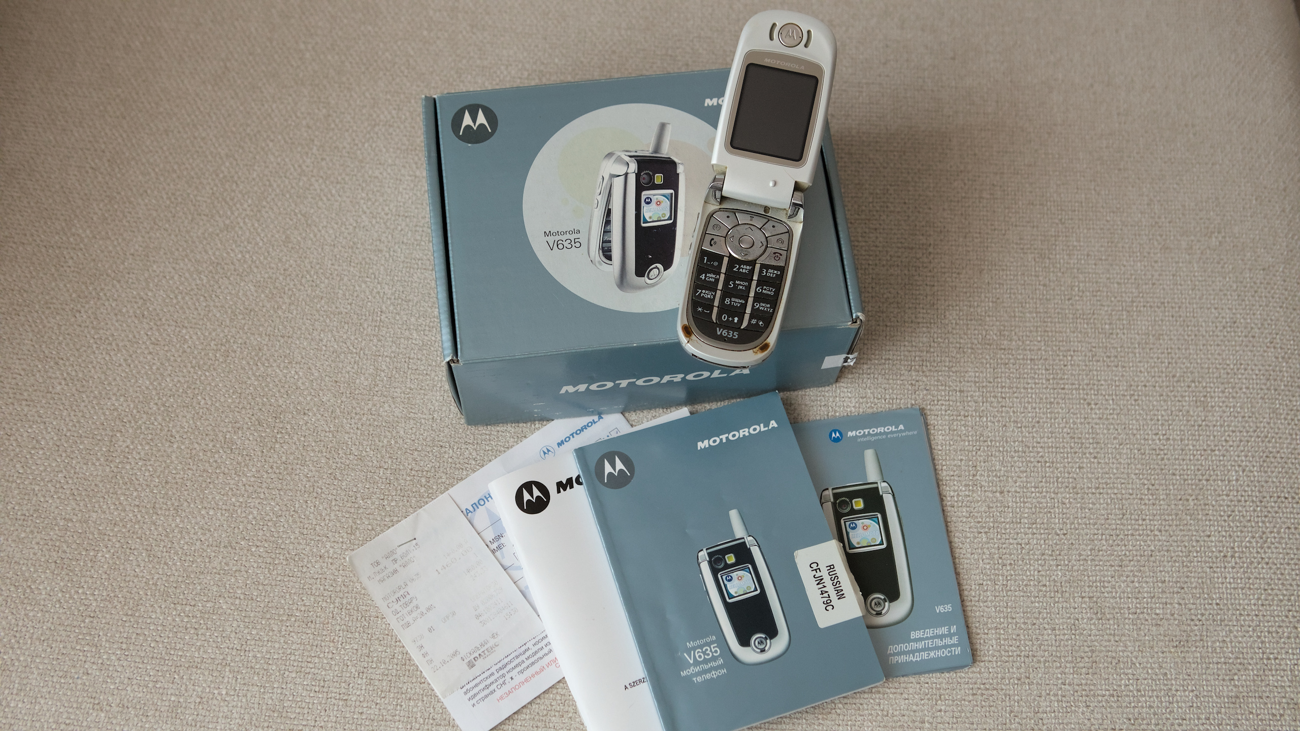 My very first phone was the Motorola V635. Me and my parents bought it back in Ukraine, in the city of Lutsk — I still remember the Allo phone shop — when I was in 10th grade. That was 2005. $310. Pretty expensive for a phone back then, but the Motorola was genuinely top-of-the-line at the time. A flip phone with two color displays, a 1.2 MP camera, SD card support, MP3, Java games, all that stuff.